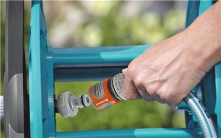 Bęben na wąż mieści do 60 metrów węża 13 mm (1/2″), 50 metrów węża 15 mm (5/8″) lub 35 metrów węża 19 mm (3/4″). GARDENA Classic bęben naścienny na wąż jest wyposażony w przyłącza kranowe. Jeśli jednak jest wymagany większy przepływ wody, bęben można w prosty sposób połączyć z GARDENA Profi-System za pomocą przyłącza kranowego Profi (art. nr 2801).