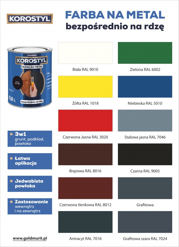 Farba na metal 3w1 to farba antykorozyjna do malowania powierzchni metali żelaznych (stal, żeliwo) oraz powierzchni narażonych na działanie czynników korozyjnych w tym powierzchni zardzewiałych.