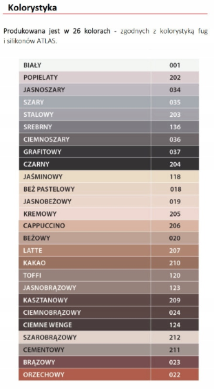 Produkowana jest w 26 kolorach, zgodnych z kolorystyką fug i silikonów ATLAS.