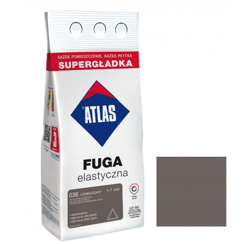 - ATLAS FUGA ELASTYCZNA produkowana jest w postaci suchej mieszanki najwyższej jakości spoiw cementowych, specjalnie wyselekcjonowanych drobnych kruszyw, wypełniaczy, pigmentów oraz dodatków modyfikujących.