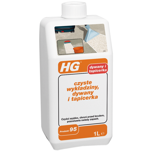 HG czyste wykładziny, dywany i tapicerka 1 l (Produkt 95) szybko i dokładnie usuwa brud z dywanów i tapicerki. Ten środek do czyszczenia dywanów wypełnia nierówne powierzchnie włókien dywanu lub tapicerki specjalną powłoką zabezpieczającą przed wnikaniem brudu.