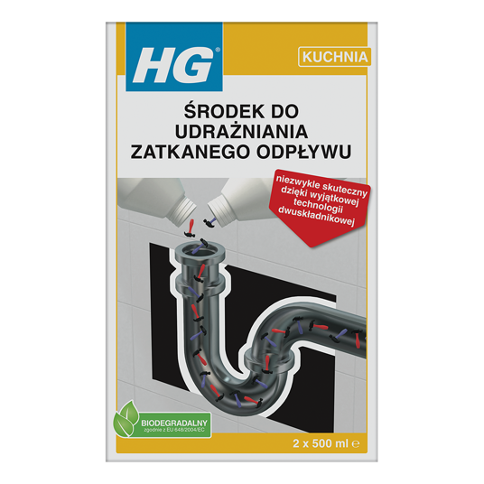 Opis produktu: HG środek do udrażniania zatkanego odpływu to profesjonalny preparat przeznaczony do skutecznego usuwania poważnych zatorów w systemach odpływowych. Dzięki unikalnej, dwuskładnikowej formule, produkt efektywnie rozpuszcza różnorodne blokady spowodowane przez tłuszcz, resztki jedzenia, włosy czy osady mydła, przywracając drożność rur zarówno w kuchni, jak i w łazience.