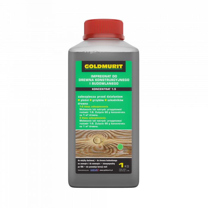 Impregnat do drewna konstrukcyjnego i ogrodowego Koncentrat 1:9 w kolorze zielonym to wysokiej jakości środek marki Goldmurit, przeznaczony do ochrony drewna przed szkodliwym działaniem czynników biologicznych.