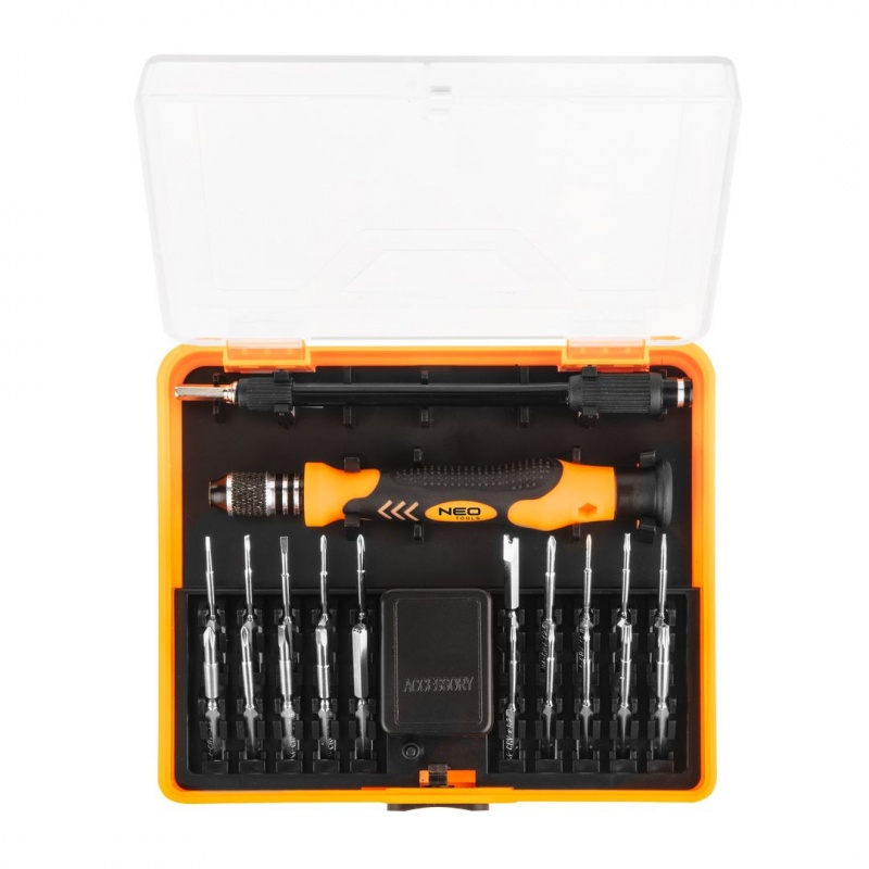 Precyzyjne końcówki wkrętakowe z uchwytem marki Neo 06-110 to zestaw 20 końcówek do popularnych modeli smartfonów. W zestawie znajduje się również przedłużka, która niezwykle usprawnia pracę, a także pinceta.