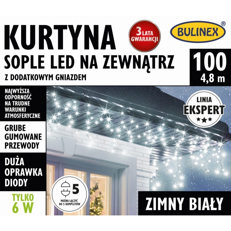 Kurtyna Bulinex sople 100 LED to idealne rozwiązanie do świątecznych dekoracji zewnętrznych, które dzięki eleganckiemu zimnemu białemu światłu nadaje otoczeniu nowoczesny wygląd. Odporność na warunki atmosferyczne oraz energooszczędność sprawiają, że jest to niezawodna i trwała dekoracja na zimowy okres.