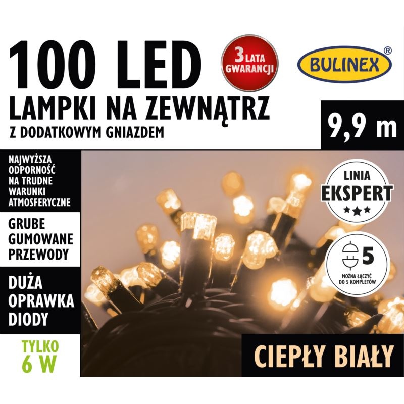 Lampki Bulinex 100 LED emitują przyjemne ciepłe białe światło, idealne do tworzenia przytulnej atmosfery na zewnątrz domu. Zestaw zawiera 100 energooszczędnych diod LED, które doskonale nadają się do dekoracji ogrodów, tarasów, balkonów czy fasad budynków. Lampki są odporne na wilgoć i deszcz dzięki klasie ochrony IP44, co czyni je trwałym rozwiązaniem na zimowe miesiące.