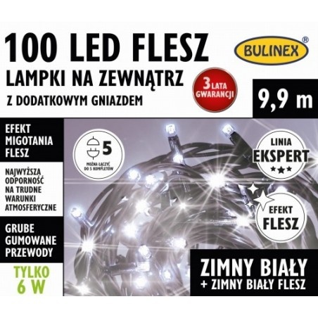 Lampki Bulinex 100 LED to nowoczesna dekoracja świetlna, idealna do ozdabiania zewnętrznych przestrzeni podczas świąt. Efekt flesza oraz zimne białe światło dodają świeżości i dynamiczności, co sprawia, że każda aranżacja nabiera nowoczesnego charakteru.
