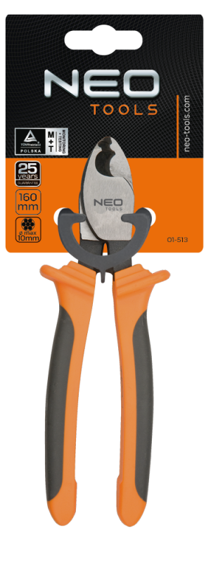 Obcinak Neo 01-513 przeznaczony do kabli miedzianych i aluminiowych. Wysokogatunkowa stal chromowo-wanadowa zapewnia długoletnią wytrzymałość szczęk. Dwumateriałowa, ergonomiczna rękojeść podnosi komfort użytkowania.