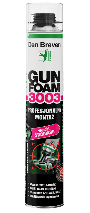 Jednoskładnikowa pistoletowa piana Den Braven Gunfoam 3003 na bazie poliuretanu to produkt odznaczający się (w odróżnieniu od piany Gunfoam 2002) skróconym czasem obróbki, podwyższonym przyrostem, jak i również wyższą przyczepnością do gładkich podłoży.