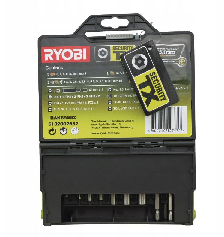 • 43 bity 25 mm (1 x PH1, 1 x PH2, 1 x PH3, 1 x PZ1, 1 x PZ2, 1 x PZ3, 1 x SL3, 1 x SL4, 1 x SL5, 1 x TX10, 1 x TX15, 1 x TX20, 1 x TX25, 1 x TX30)