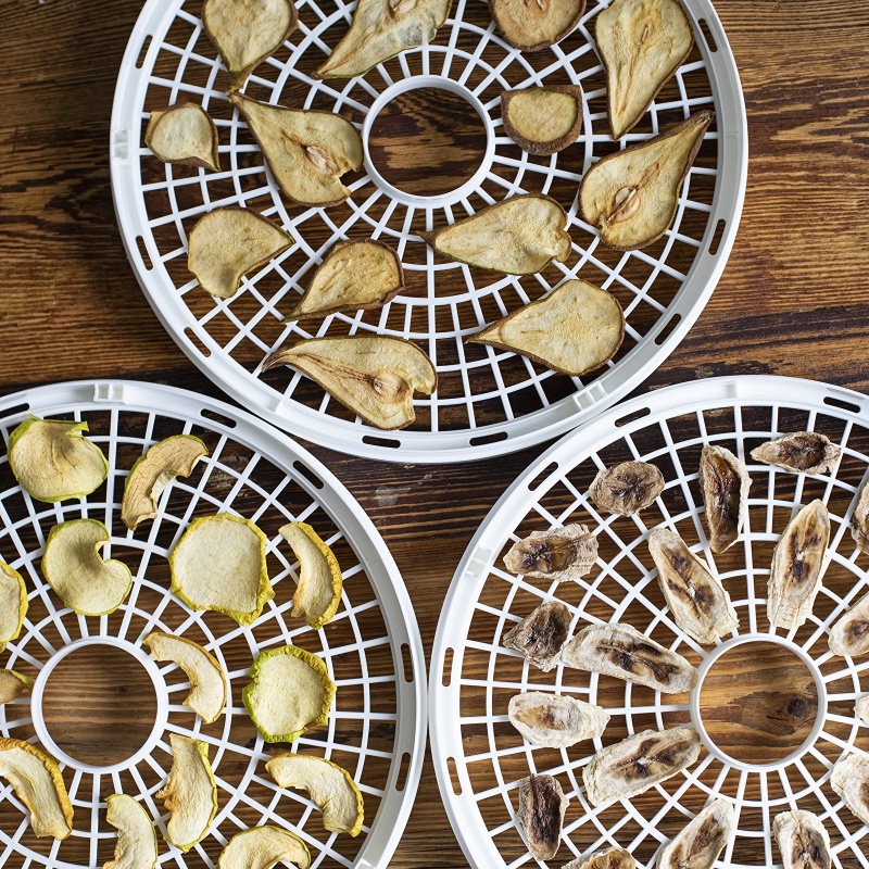 Duża, biała suszarka do żywności o mocy 500 W z regulacją temperatury pozwala na przyrządzenie zdrowych, pełnych wartości odżywczych suszonych owoców, warzyw, grzybów, mięs czy ziół bez potrzeby dodawania konserwantów, soli czy cukrów.