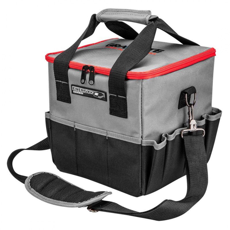 Torba posiada 14 kieszeni zewnętrznych, 3 pojemne kieszenie wewnętrzne oraz 9 zaczepów na narzędzia. Zaczepy pozwalają na przymocowanie takich narzędzi jak wiertarko-wkrętarki (zaczep metalowy) czy miary zwijane (zaczepy materiałowe). Wymiary torby umożliwiają komfortowe przenoszenie do dwóch elektronarzędzi wraz z osprzętem (akumulatory, ładowarka, dodatkowe akcesoria). Akumulatory, jak i inne elementy można zabezpieczyć przed przemieszczaniem za pomocą dodatkowych pasków na rzep. Torba posiada wygodny i solidny uchwyt do przenoszenia oraz dodatkowo regulowany pasek na ramię z metalowymi karabińczykami. Usztywnione, wodoodporne dno z nóżkami chroni zawartość podczas pracy w trudnych warunkach. Na tylnej ściance umieszczono okienko na spersonalizowaną etykietę lub wizytówkę.