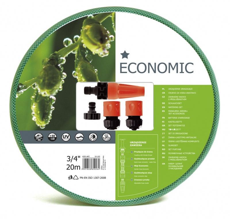 Zestaw do podlewania, zawiera wąż ogrodowy ECONOMIC i komplet końcówek pakowanych w blister. Długość 20m, rozmiar 3/4”.