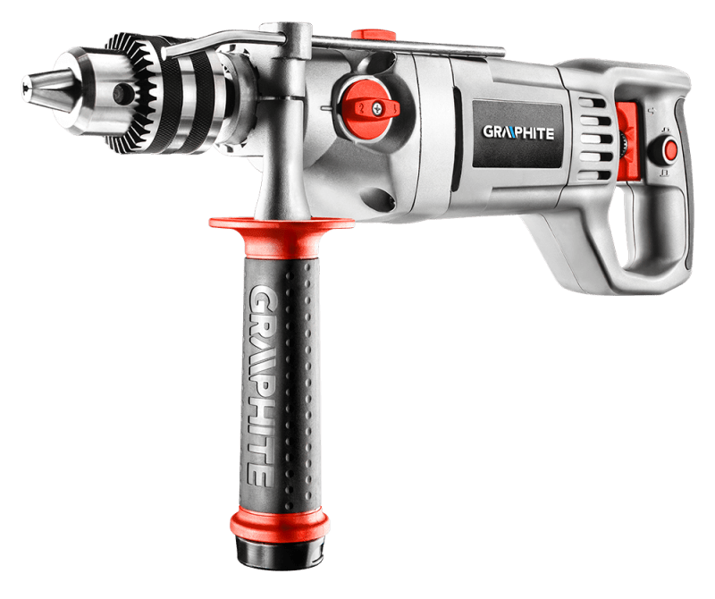 Wysokiej klasy dwubiegowa wiertarka udarowa GRAPHITE napędzana silnikiem o dużej mocy 1050 W, niezawodna przy wierceniu otworów w drewnie, metalu, ceramice czy tworzywach sztucznych. Po przejściu na tryb pracy udarowej wiercenie w materiałach takich, jak beton lub cegła również nie sprawi jej problemu. Maksymalna średnica wierconego otworu w drewnie wynosi 40 mm, w betonie 20 mm, a w stali 16 mm. Uchwyt kluczykowy obsługuje wiertła w zakresie od 3 do 16 mm. Wiertarka posiada możliwość zmiany kierunku obrotu głowicy. W zależności od tego, na którym biegu pracuje, podczas wiercenia osiąga do 900 lub 2500 obrotów, a podczas pracy udarowej do 14000 lub 40000 uderzeń na minutę. Solidna ergonomiczna konstrukcja oraz długi przewód zasilający ułatwią pracę w trudno dostępnych miejscach. Pracę w ciężkich warunkach ułatwi również funkcja blokady włącznika, dająca możliwość ciągłej pracy ze stałą prędkością oraz opcja regulacji obrotów stopniem nacisku włącznika. Zgodność z europejskimi standardami zapewnia certyfikat CE.