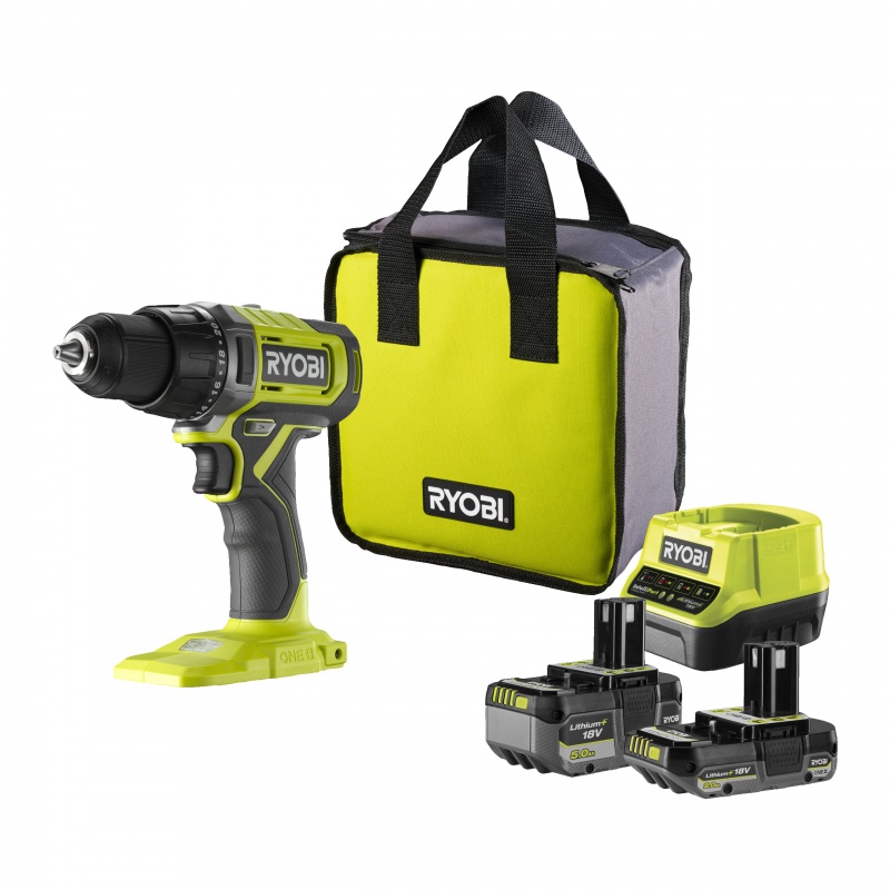 Akumulator 5,0 Ah (zawarty w zestawie) umożliwi wywiercenie do 276 otworów 16×50 mm w drewnie narzędziem RDD18 RYOBI. Oferta zawiera narzędzie, dwa akumulatory 2.0 i 5.0 Ah, ładowarkę i torbę.
