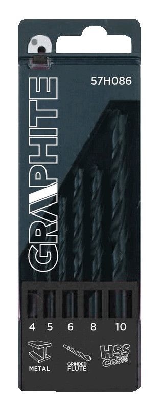 Wiertła do metalu Graphite 57H086 o średnicach od 4 do 10 mm wykonane z wysokogatunkowego stopu stali szybkotnącej M35 z dodatkiem kobaltu. . Kąt wierzchołkowy 135° i korekta ścinu umożliwiają łatwe nawiercanie otworów bez punktowania. Idealnie nadaje się do wiercenia otworów w materiałach trudnoobrabialnych, tak jak stal nierdzewna, kwasoodporna, żaroodporna itp.