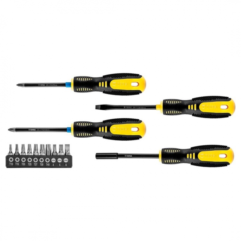 Zestaw wkrętaków i końcówek wkrętakowych 24 szt.(LxWxH) 250 x 140 x 35 mm, stal CRV, rozmiary wkrętaków SL 6,5mm, PH1, PH2, rozmiary końcówek: płaskie 4, 5, 6 mm, Torx T10, T15, T20, T25, T27, T30, T40