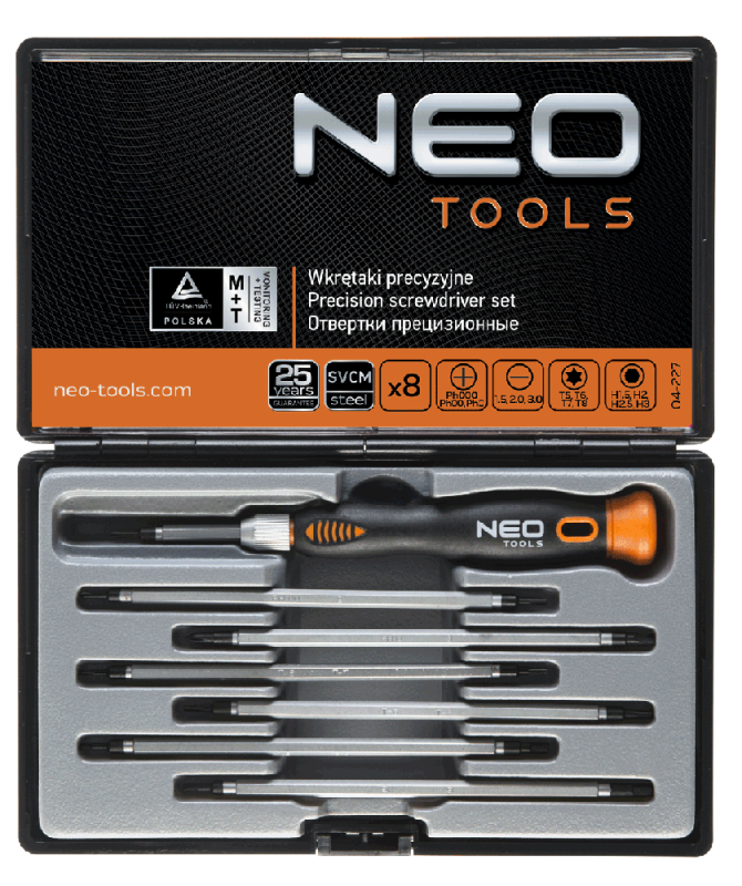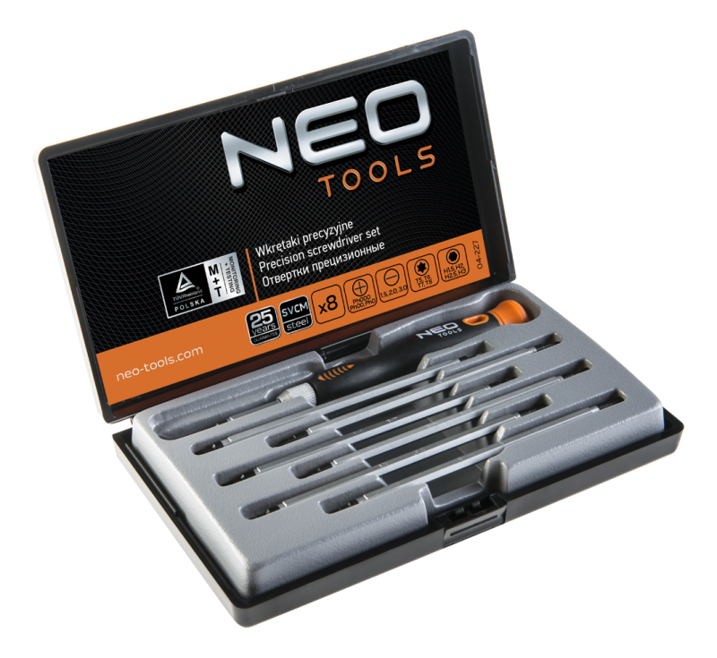 Zestaw wkrętaków precyzyjnych NEO zawiera uchwyt i 7 dwustronnych bitów 120 mm (płaskich, krzyżowych, Torx i sześciokątnych). Magnetyczne końcówki wykonane są z wyjątkowo wytrzymałej stali chromowo-molibdenowej. Obrotowa nasadka w rękojeści umożliwia precyzyjnie dokręcanie śrub. Uchwyt dwumateriałowy odporny jest na działanie chemikaliów, olejów i smarów. Jakość narzędzia potwierdzona certyfikatem TÜV i 25-letnią gwarancją producenta.