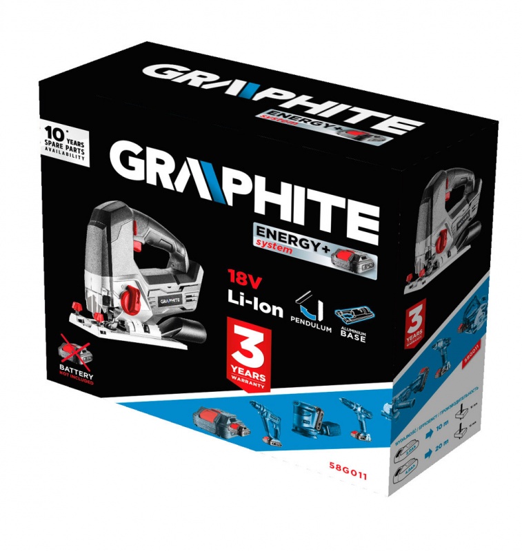 Wyrzynarka akumulatorowa Graphite 58G011 to produkt przeznaczony do precyzyjnego i szybkiego cięcia drewna i metalu (o grubości 80 mm i 10 mm). Produkt posiada układ regulacji obrotów, a także wyposażony jest w aluminiową stopę z regulacją kąta nachylenia w zakresie od 0° do 45° w prawo i lewo. Urządzenie stworzone z myślą o wygodnej i komfortowej pracy zostało wyposażone w 3-stopniową regulację wielkości ruchu wahadłowego, pozwalającego na zwiększenie szybkości cięcia w wybranych materiałach.